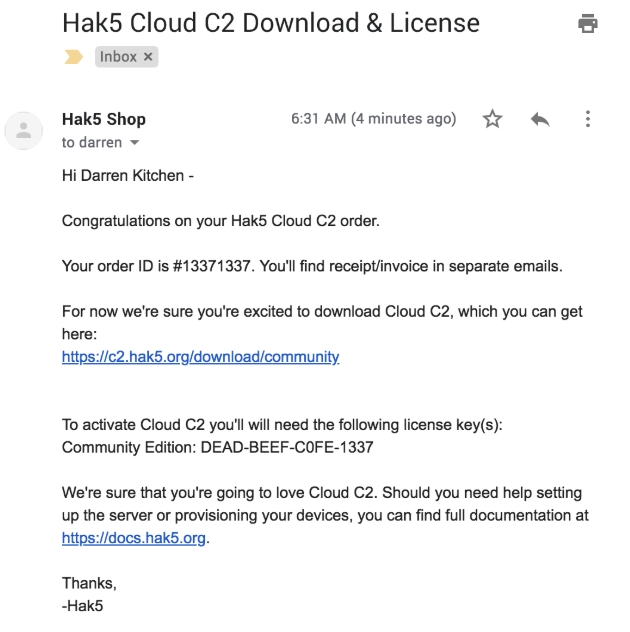 After placing the order, an email from [email protected] with the subject line "Hak5 Cloud C² Download & License" will be sent containing a download link and license key.